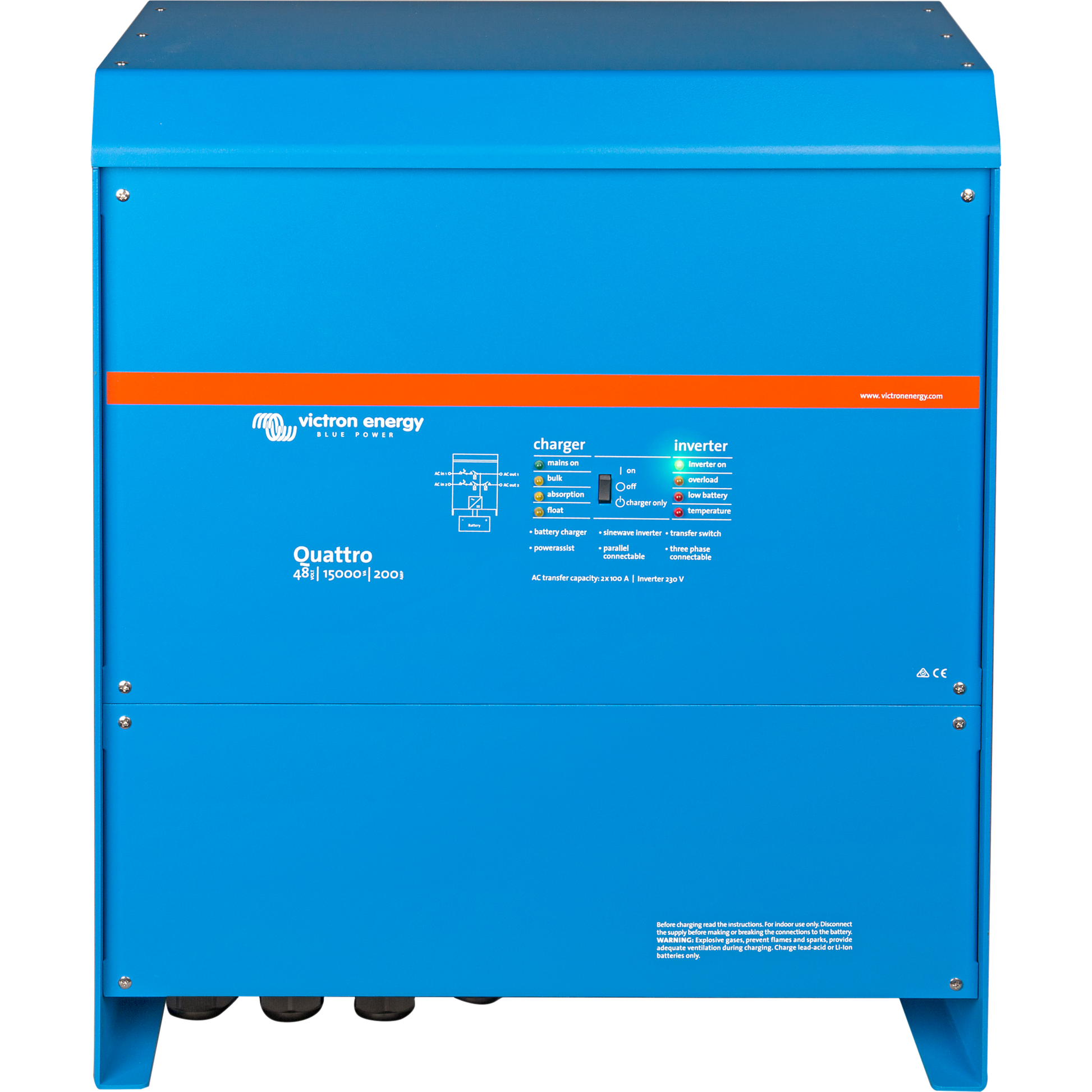 Similar to the MultiPlus, the Quattro 48/15000/200-100/100 is also a combined inverter and charger. Additionally it can accept two AC inputs and automatically connect to the active source. Its many features include a true sine wave inverter, adaptive charging, hybrid PowerAssist technology plus multiple system integration features such as three or split phase operation and parallel operation.